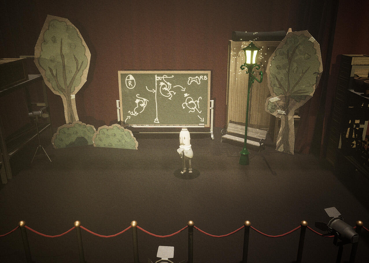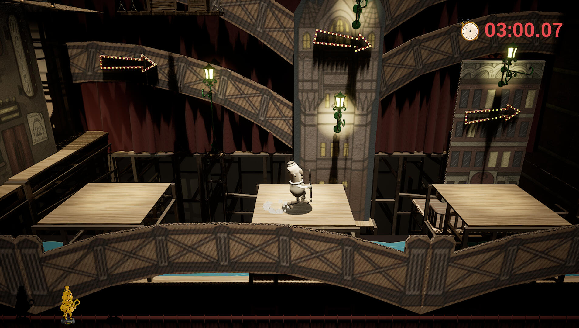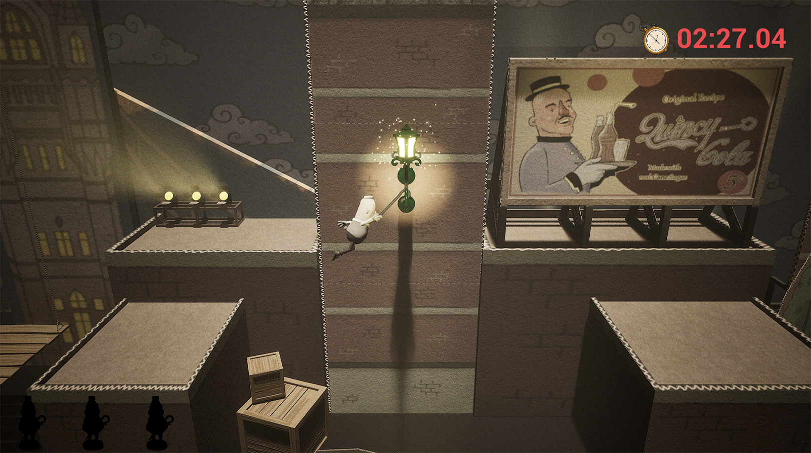 Le thème film noir a été choisit comme thème iconographique durant les premiers brainstorms et l'idée du protagoniste est venu facilement par la suite. C’est ainsi qu’est né le charmant Quincy Wigglesworth, une star du cinéma muet inspirée de Buster Keaton, connu pour ses cascades audacieuses.Le jeu nécessitait également un changement de rythme. Lorsque le joueur se rend donc à la fin de la scène, il devra ensuite repasser à travers le niveau en sens inverse, comme dans les jeux metroidvania. Le retour est parcontre tumultueux, avec des éléments du décor tombant de manière chaotique, ainsi que l'ajout de nouveaux chemins pour créer un sentiment de terreur et d'urgence.