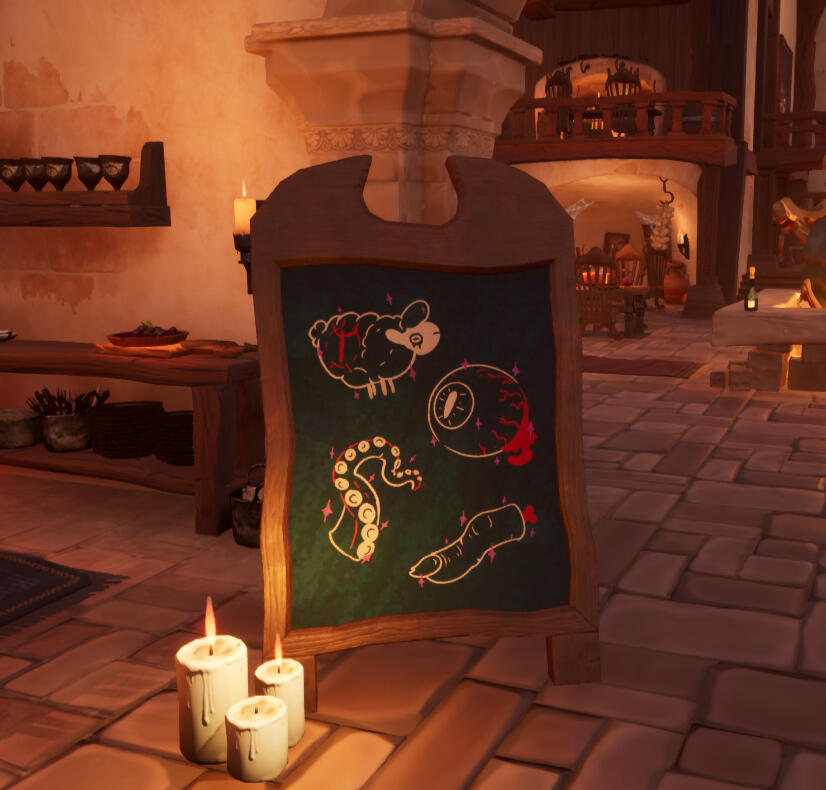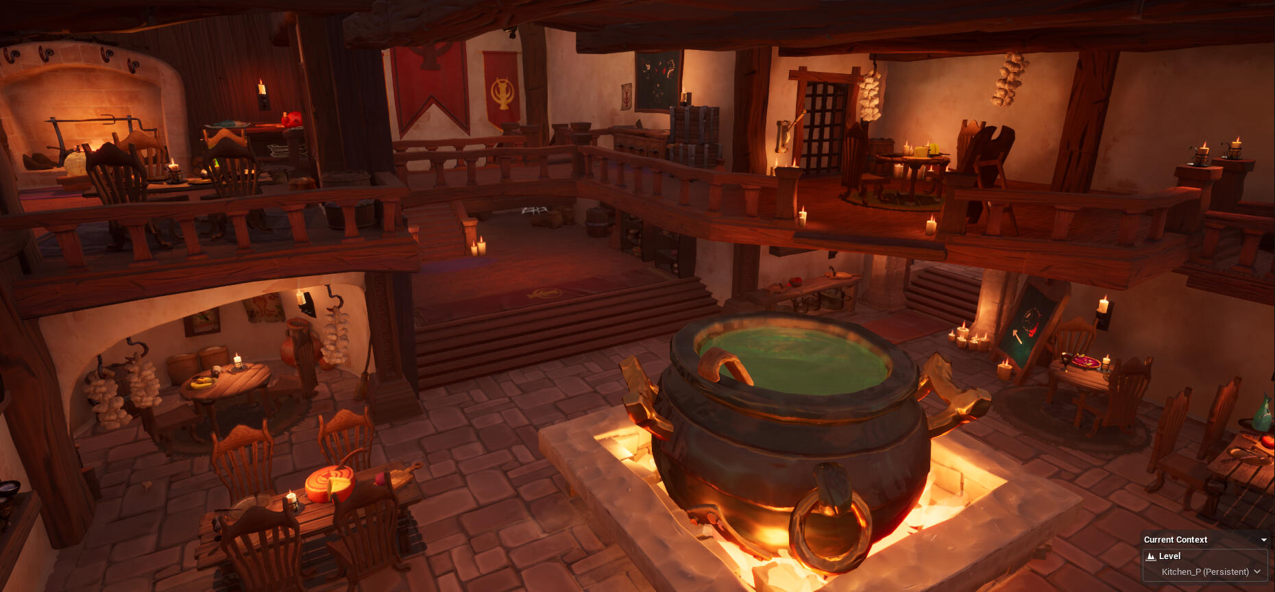Dès l'entrée dans le niveau, je voulais donner une mission claire aux joueurs: celle d'accomplir une recette en lançant des ingrédients dans le grand chaudron situé au centre. Ces ingrédients se retrouvent éparpillés dans le niveau et sont récupérés soit à la suite d'un défi, soit lors d'un mini-jeu.