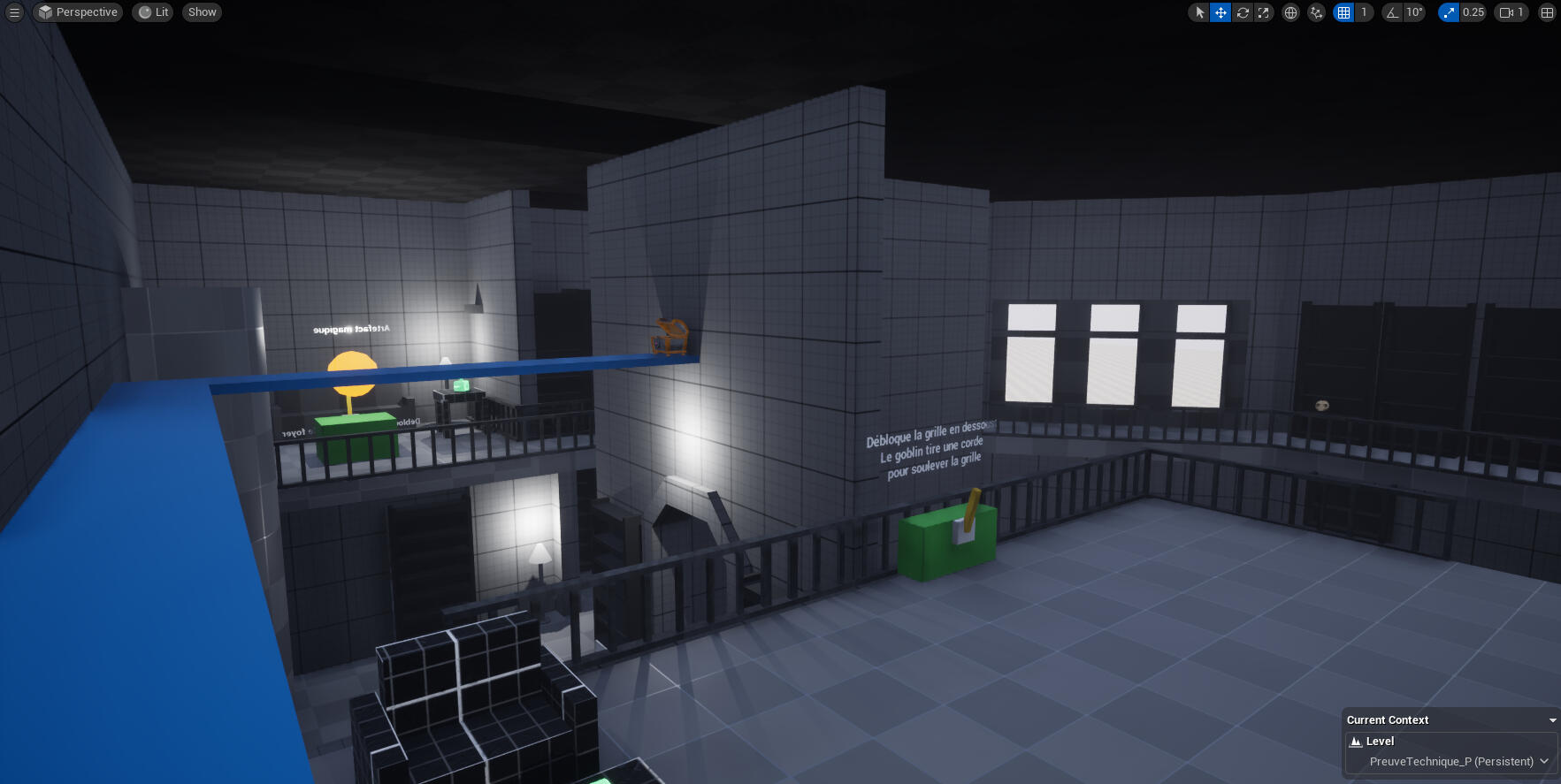 Voici quelques images du niveau de la preuve technique que j'ai créé. Il est entièrement en greyboxing.Les tiroirs blancs peuvent s'ouvrir et cacher du loot. Les éléments bleus indiquent les surfaces qu'on peut traverser ou sauter par-dessus. Les éléments interactifs sont en vert, tandis que les leviers sont en jaune. Certaines sections comportent également des explications textuelles afin d'apporter des clarifications.