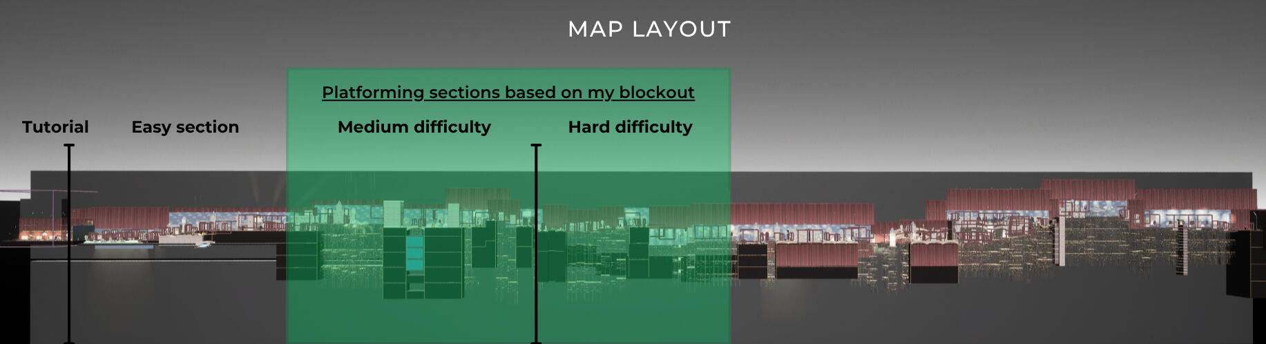 Pour ce projet, je me suis principalement concentrée sur la conception des niveaux. Avec les trois autres designers de l'équipe, nous avons divisé le niveau du jeu en plusieurs sections comprenant trois niveaux de difficulté: facile, moyenne et difficile. J'ai travaillé sur plusieurs sections du niveau, incluant toutes les difficultés. Environ deux sections par difficulté que j'ai conçues dans le blocking se retrouvent dans le niveau final.