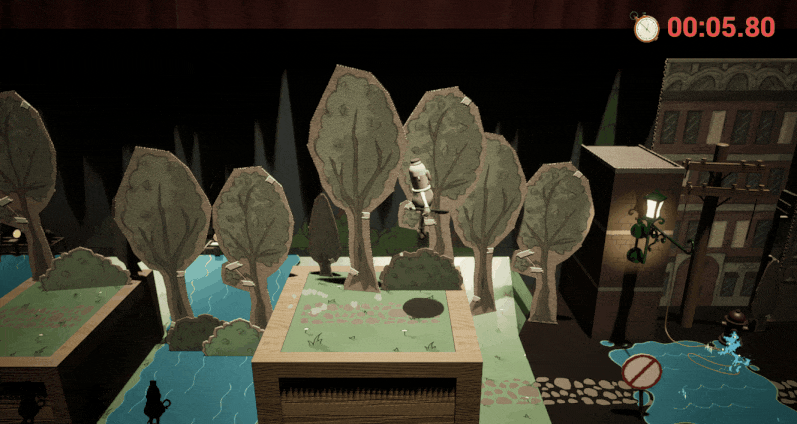Originally, the project featured AI enemies disguised as actors in cardboard cutouts and funny costumes. However, after playtesting, players actually preferred racing against the clock and competing for high scores.We decided to embrace this speedrun aspect, adding a timer to the top of the screen and checkpoints to support fast-paced gameplay.I tested the level so many times that I accidentally became its speedrun champion. Along the way, I tweaked invisible walls so players wouldn’t get stuck, fine-tuned the timing of falling props, and added new pathways with collapsing buildings to keep things exciting.